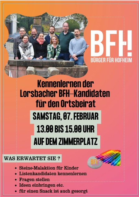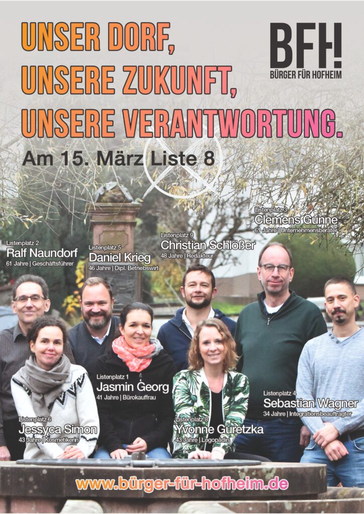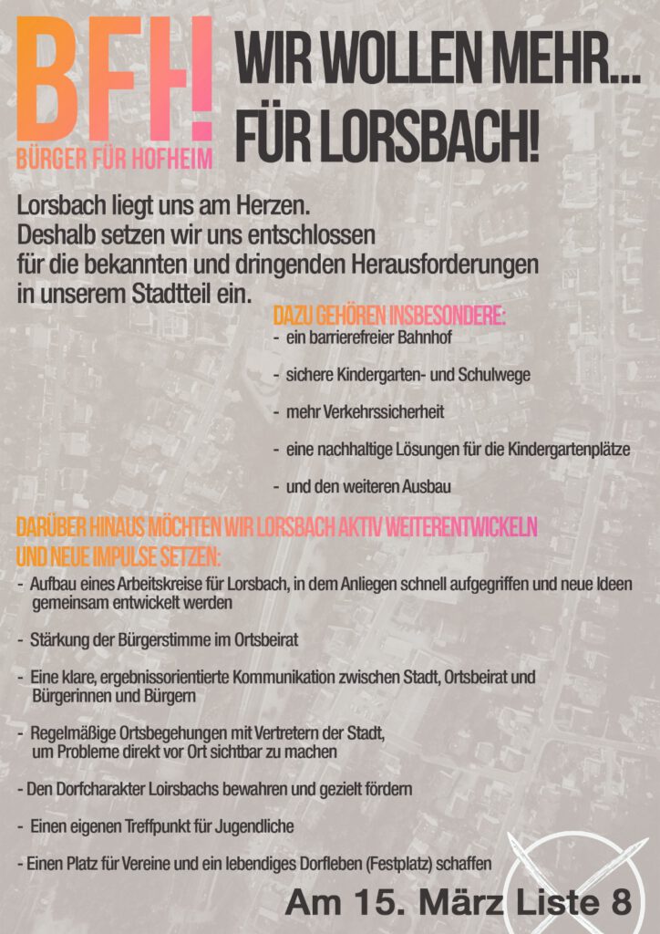 Die Bürger für Hofheim (BfH) gehen mit einem breit aufgestellten und engagierten Team in die kommende Kommunalwahl und präsentieren ihre Kandidatinnen und Kandidaten für den Ortsbeirat Lorsbach. Die Liste vereint unterschiedliche berufliche Hintergründe, langjährige kommunale Erfahrung sowie frische Impulse aus der Lorsbacher Bürgerschaft. Gemeinsam stehen sie für eine konstruktive, bürgernahe und lösungsorientierte Politik, die die Interessen des Ortsteils in der Hofheimer Stadtpolitik stark vertreten will.