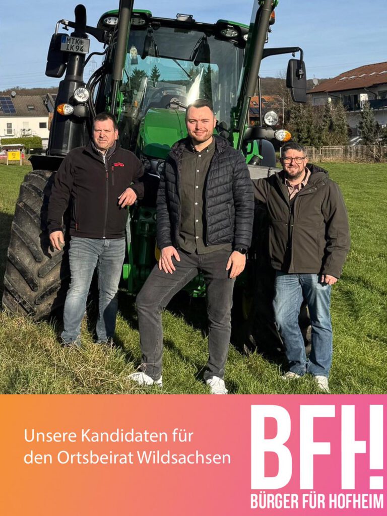 Zur kommenden Ortsbeiratswahl im Jahr 2026 präsentiert die BfH sich in Wildsachsen mit einem engagierten Team: Mit Maik Gröhl, René Müller und Ingo Küther stellen sich drei Kandidaten zur Wahl, die ihre Heimat Wildsachsen seit Kindheitstagen kennen und lieben. Ihr gemeinsames Ziel: die Stärken des Ortsteils bewahren und zukunftsorientiert weiterentwickeln. Alle drei Kandidaten verbindet das klare Bekenntnis: Der Ort Wildsachsen liegt uns am Herzen! Sie stehen für eine bodenständige, engagierte und zukunftsorientierte Vertretung der Wildsächser Interessen im Hofheimer Stadtparlament.